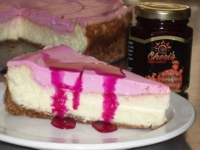 Stir jelly into sour cream to break up jelly clumps and carefully pour over cheesecake. Bake 5 minutes. Remove and place on a cooling rack. Cool completely before removing rim. Refrigerate 4 hours. If desired, drizzle Cheri's Prickly Pear Cactus Syrup on top before serving.